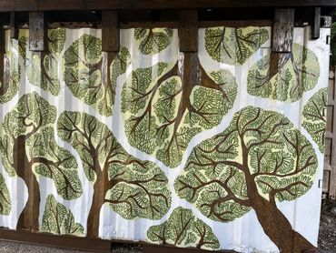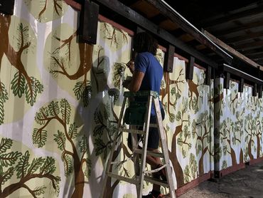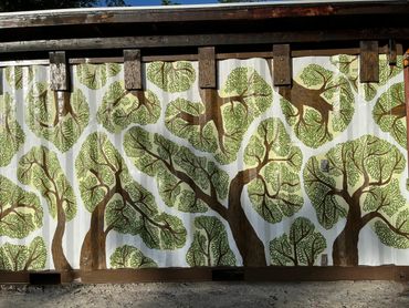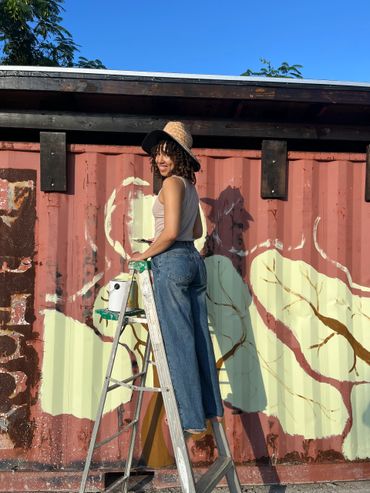 Creating a mural for a playground requires keeping children at the center of the design. I thought about how they would run through the space, how they might use the imagery to invent their own stories, and how the mural could become part of their imaginative world. With that in mind, I wanted to transform the rusting shipping containers into a space that feels dynamic and alive—one that reflects movement, incorporates elements of nature, and also serves as a welcoming backdrop for adult cookouts and community gatherings. Set beneath the trees, the mural supports a shared space within a 31-unit community of young parents. Notably, many tenants shared that before the playground was built, they were unaware that children even lived within the complex.