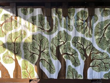 The question guiding the work was: how can a painted surface appear alive, yet remain in harmony with nature? The solution emerged through careful study of movement and perception. As the mural directly faces the court, its design also needed to avoid distracting players. Brushstrokes were tested in motion — stepping into player stances, shifting side to side — to ensure they were long enough to hold visual coherence against the speed of a ball in play, yet short enough to evoke the textures of bushes and foliage in the surrounding landscape.